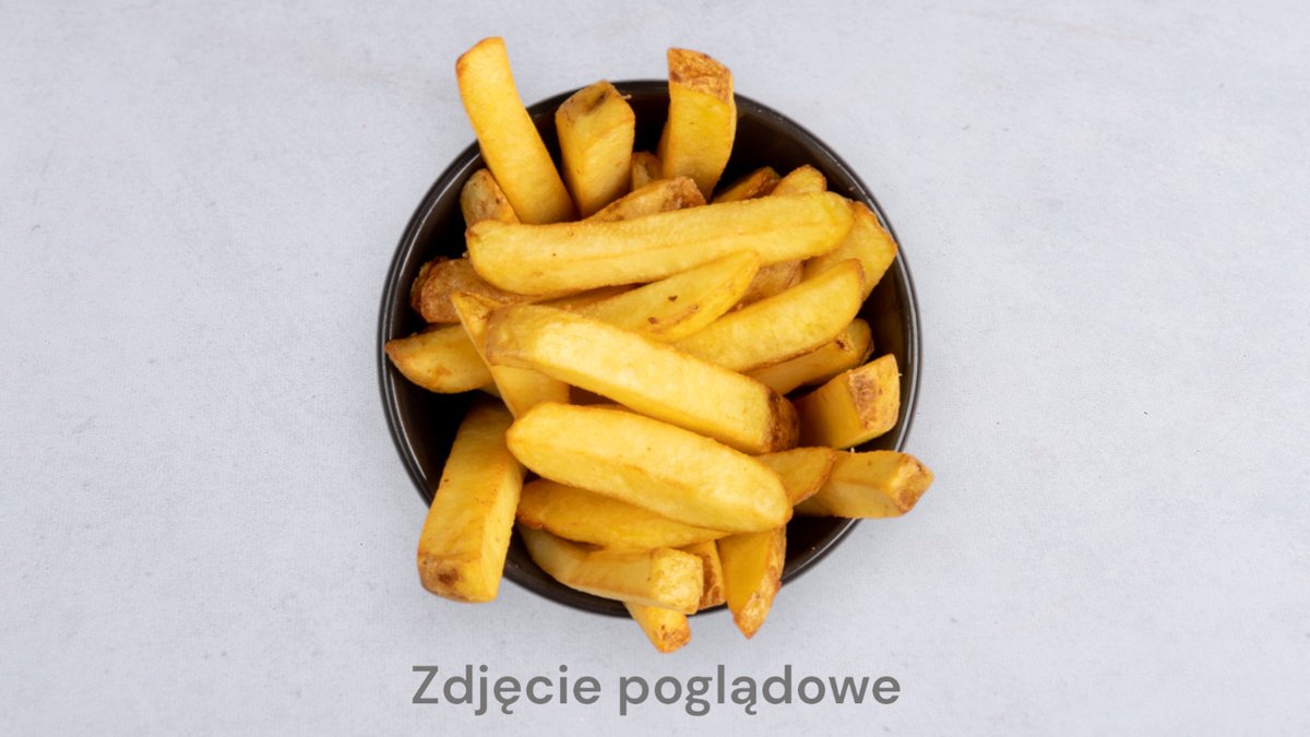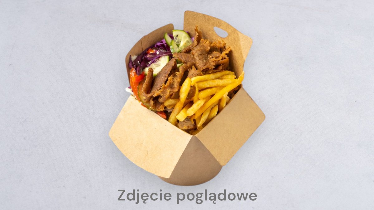 Mięso, sałata lodowa, czerwona cebula, pomidor, świeży ogórek i dwa sosy do wyboru, Frytki
