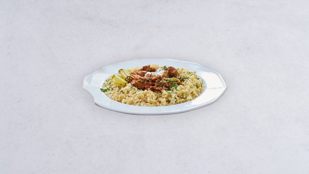 Gulasz wieprzowo-wołowy z ogórkiem kwaszonym, podawany z kaszą, ziemniakami opiekanymi lub frytkami do wyboru