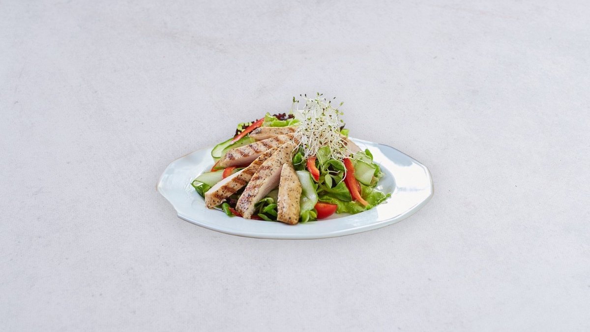 Grillowana pierś z kurczaka podana na kruchych sałatach ze świeżymi warzywami i salsą ziołową