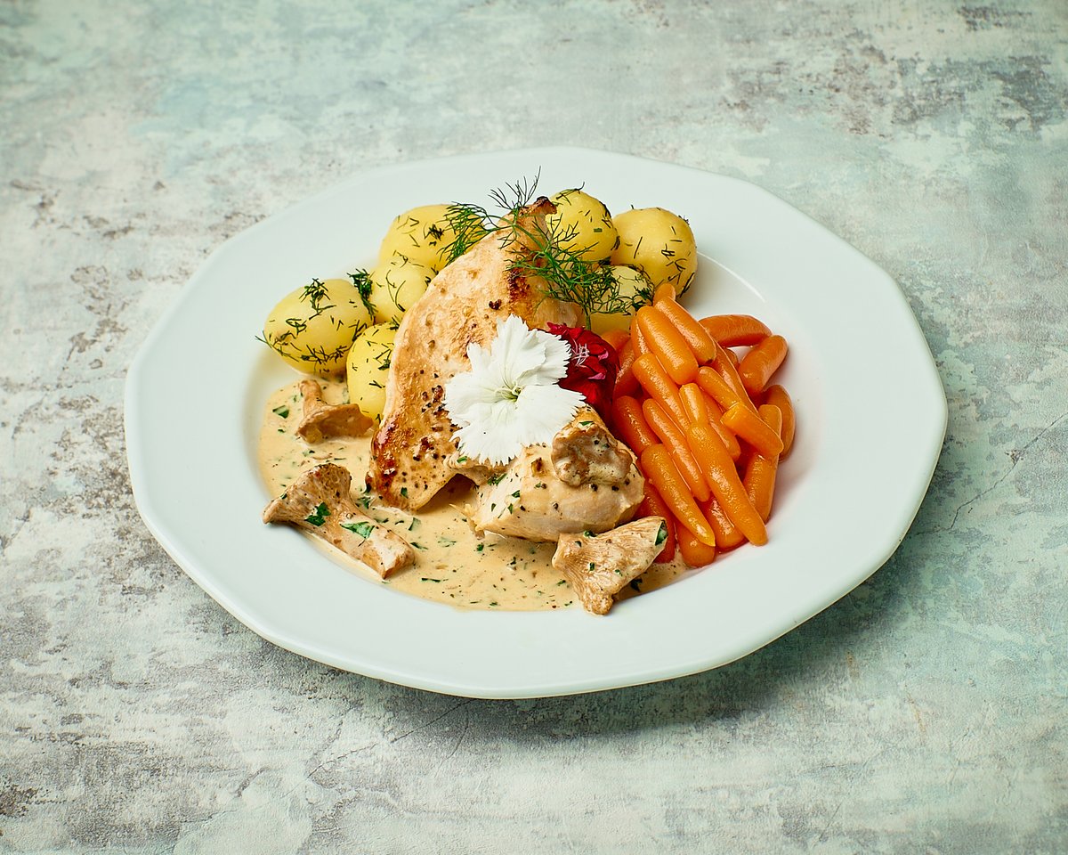 Filet z kurczaka w sosie kurkowym z młodymi ziemniakami