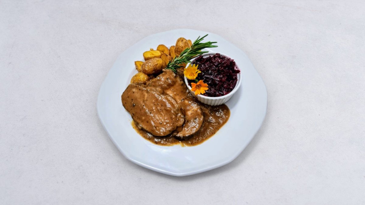 Pieczeń z karkówki w sosie pieczeniowym podana z buraczkami i dodatkami