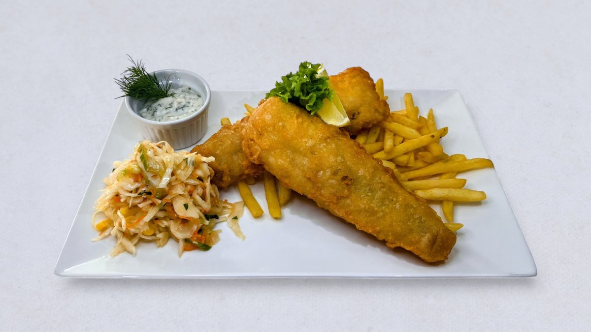 Dwa kawałki mintaja w tempurze podany z sosem tatarskim surówką i dodatkami