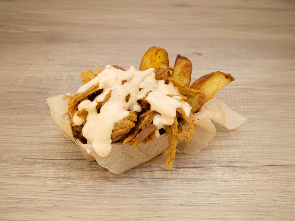 Pieczone ziemniaki z solidną porcją szarpanego seitanu z naszym sosem spicy mayo.