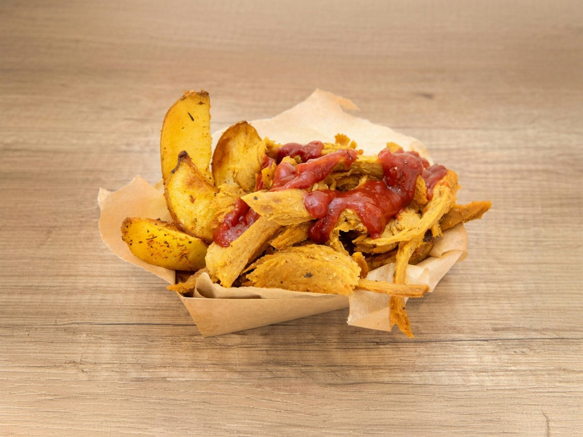 Pieczone ziemniaki z solidną dawką szarpanego seitanu z naszym kultowym sosem czosnkowo-pietruszkowym.