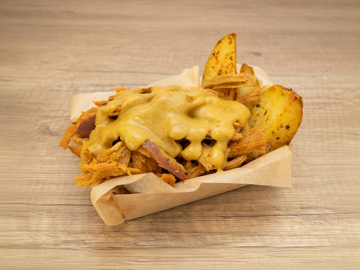 Pieczone ziemniaki z solidną garścią szarpanego seitanu z naszym musztardowo-karmelowym sosem.