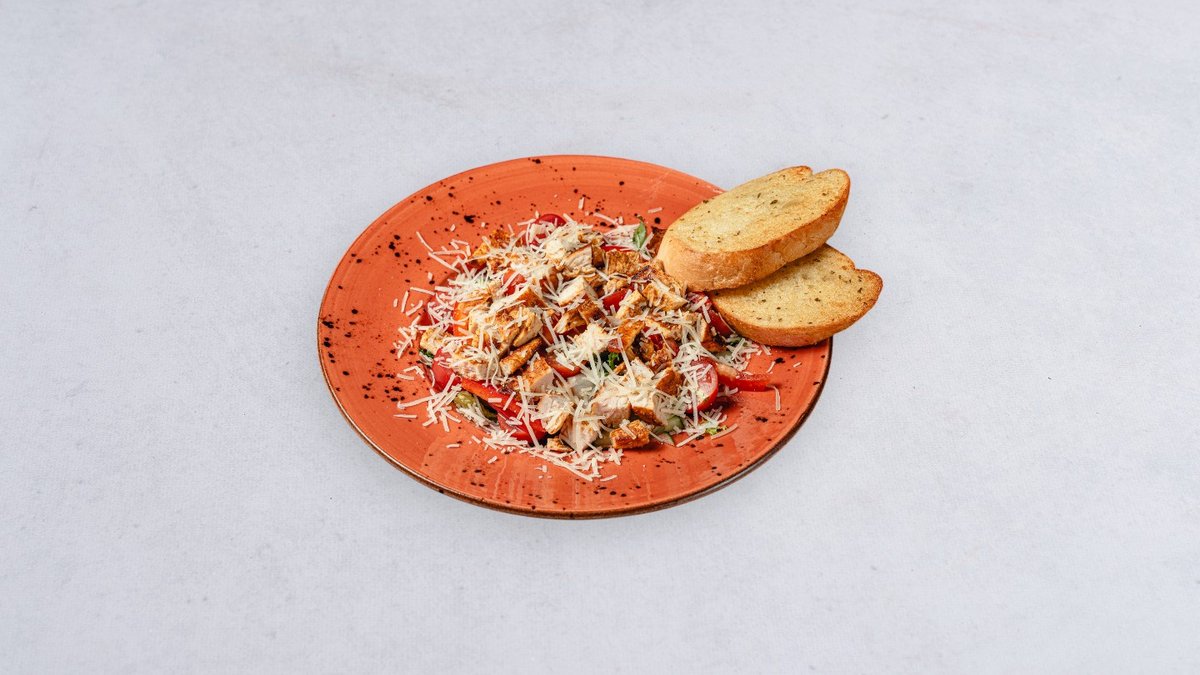 grillowana pierś z kurczaka, sałata rzymska w naszym autorskim sosie Caesar, pomidorki koktajlowe, parmigiano reggiano DOP