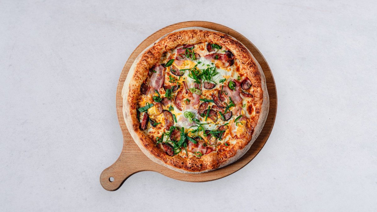 Sos, ser, boczek, kiełbasa, jajko, szczypiorek