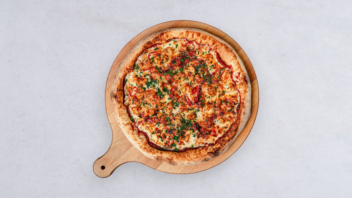 Sos, ser, papryka pepperoni, krewetki, natka pietruszki świeża