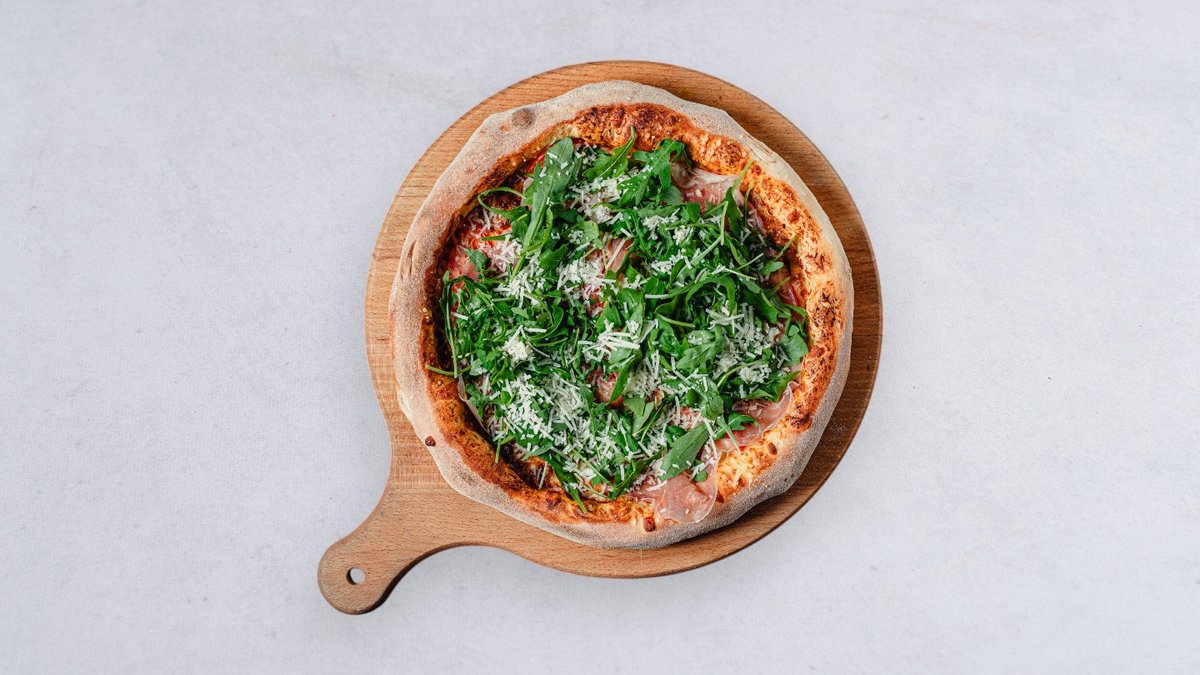 Sos, ser, pomidor, długodojrzewająca szynka włoska, rucola, parmiggiano reggiano