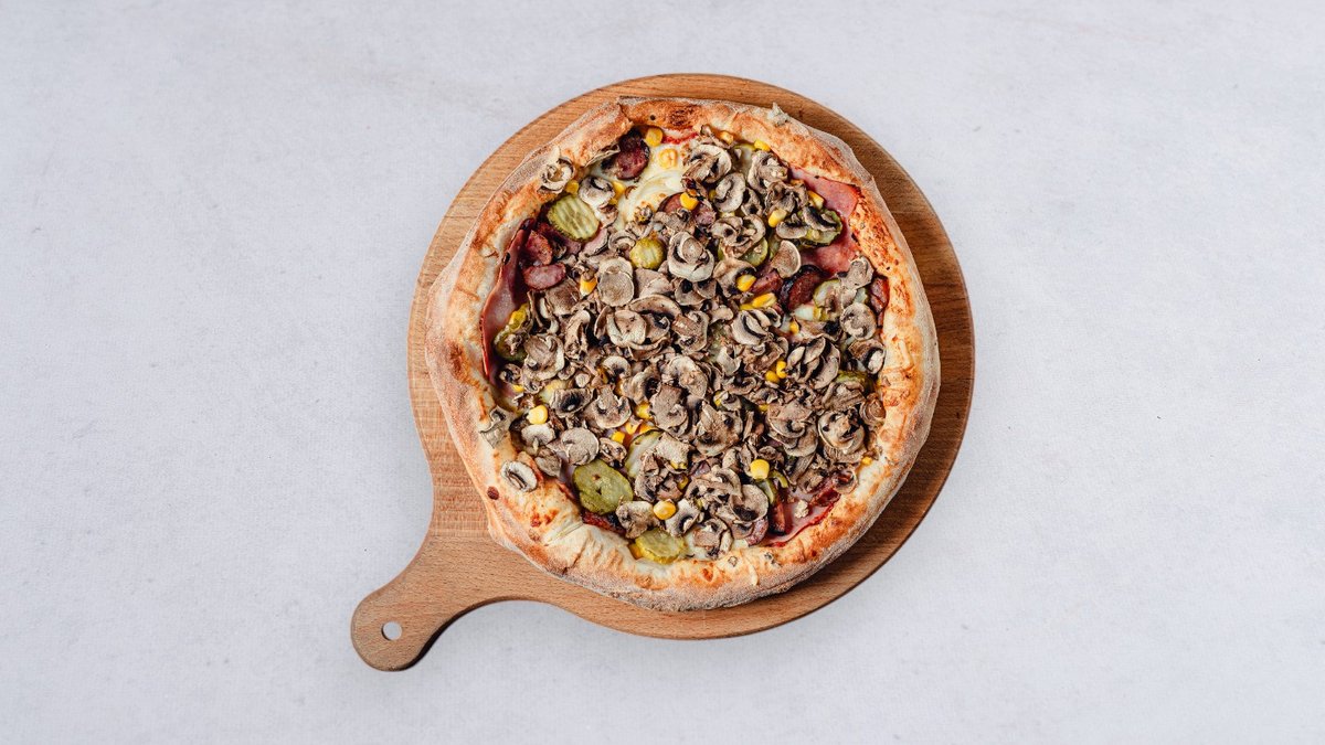 Sos, ser, cebula biała, szynka, kukurydza, ogórek konserwowy, kiełbasa, pieczarki