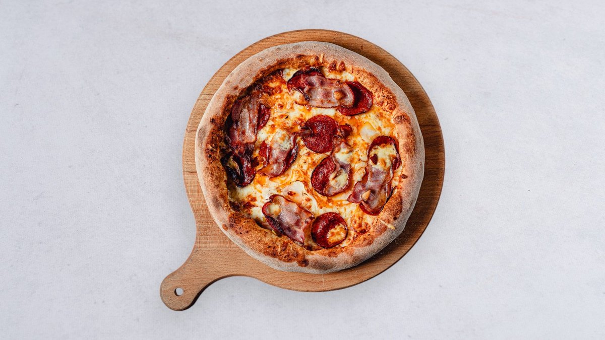 Sos, ser, cebula biała, salami pepperoni, boczek, ser wędzony