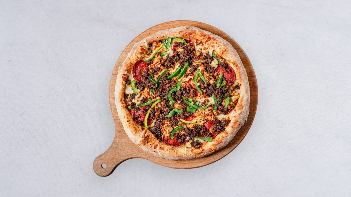 Sos, ser, cebula biała, salami pepperoni, kurczak, papryka zielona, wołowina