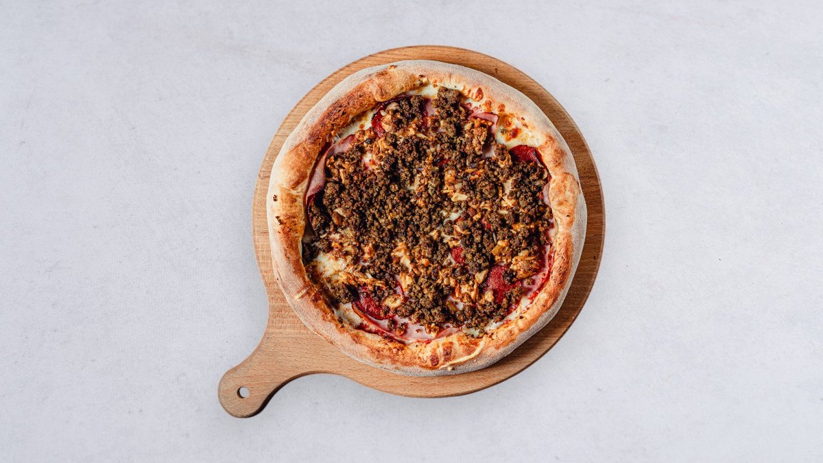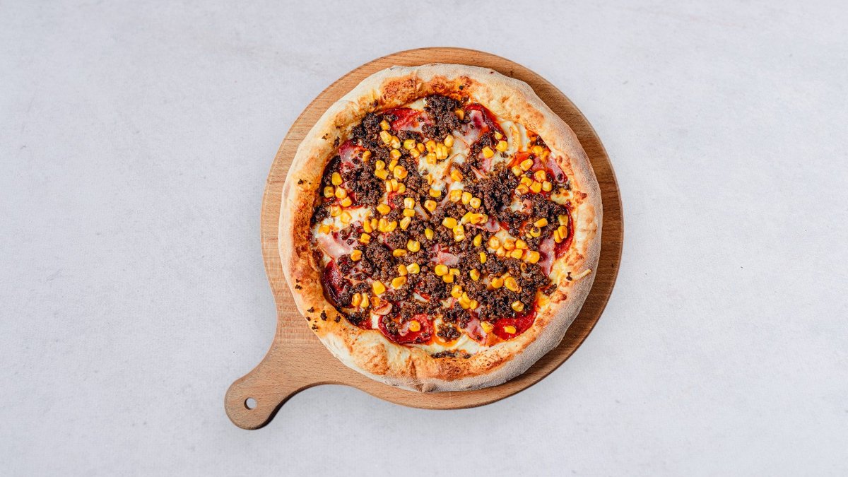 Sos, ser, cebula biała, kukurydza, salami pepperoni, boczek, wołowina