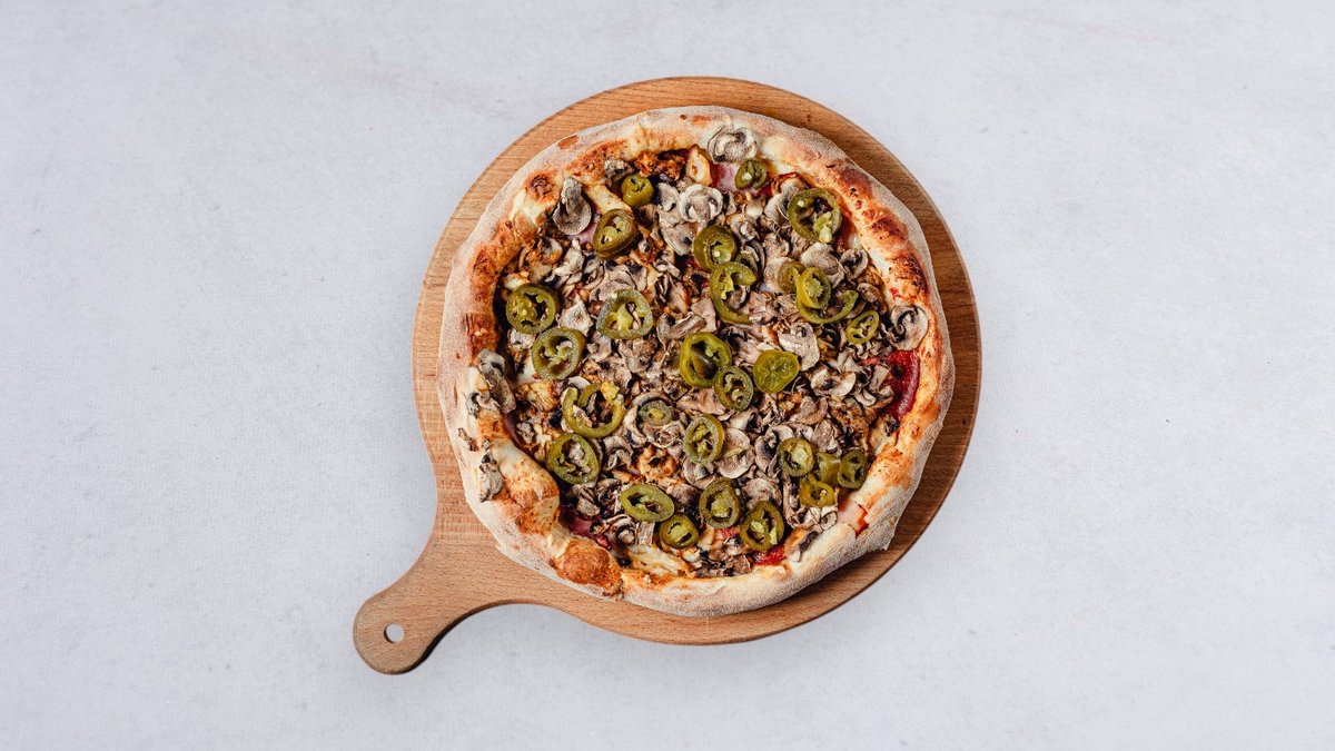 Sos, ser, cebula biała, salami pepperoni, jalapeño