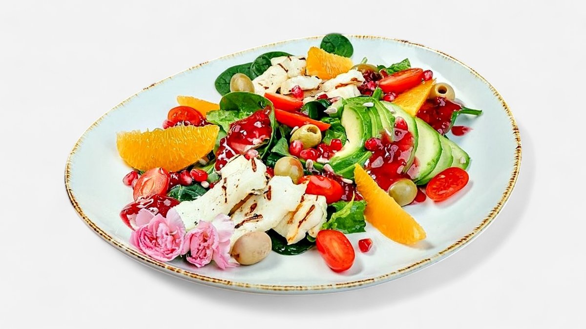 grillowane halloumi | filet z pomarańczy | pomidorki koktajlowe | sałata rzymska | szpinak baby | oliwki zielone | awokado | granat| pestki słonecznika | vinegret żurawinowy