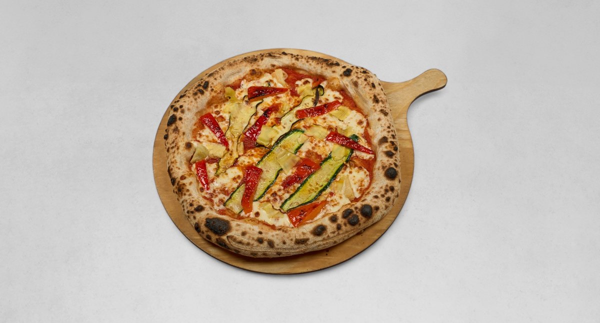 Sos pomidorowy, mozzarella fior di latte, grillowana cukinia, karczochy, grilowana papryka