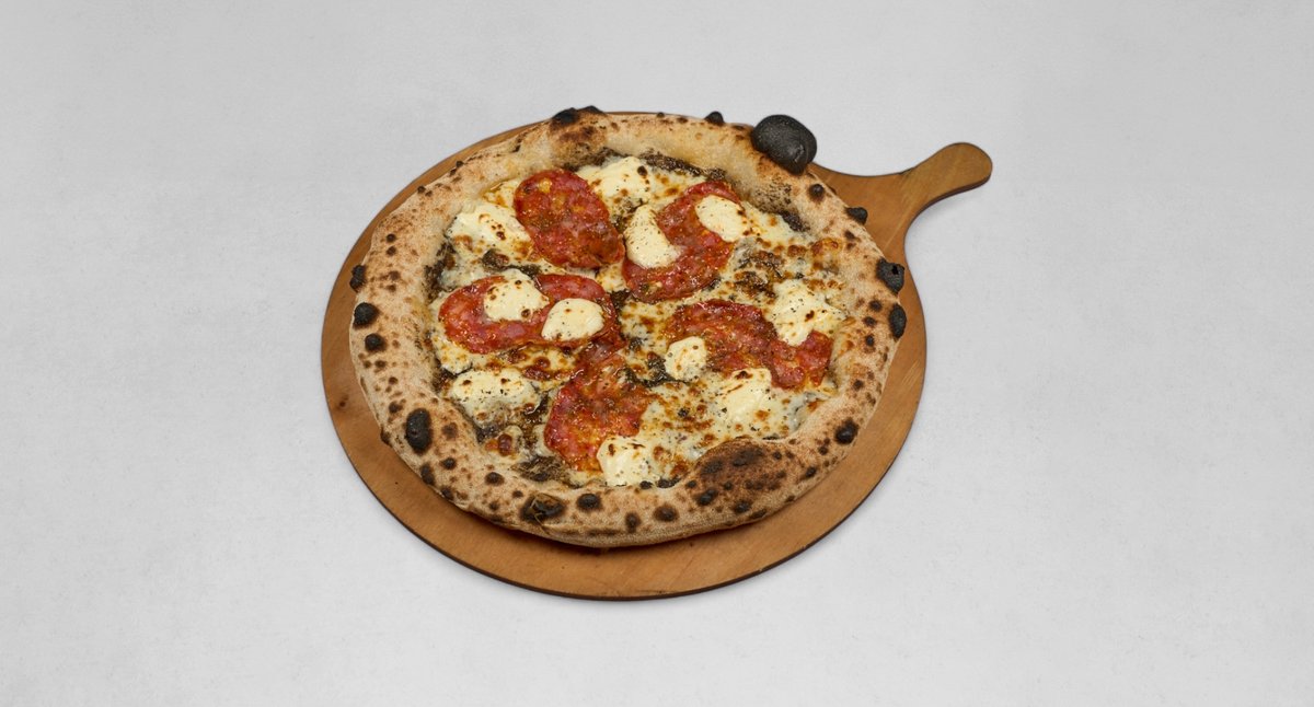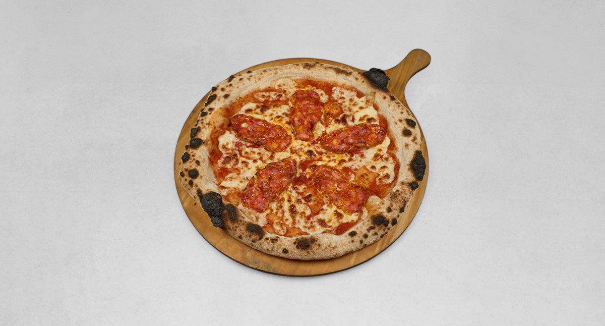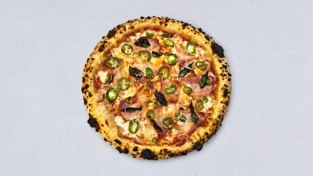 sos pomidorowy, mozzarella fior di latte, pancetta, jalapeno, bazylia, oliwa chilli, parmezan