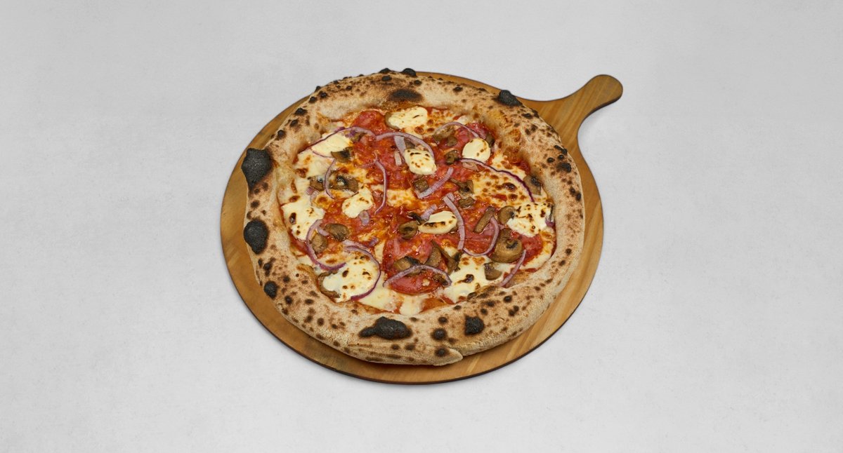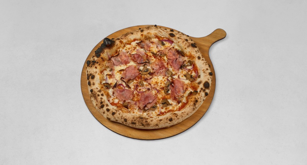 Sos pomidorowy, mozzarella fior di latte, prosciutto cotto, pieczarki, czerwona cebula