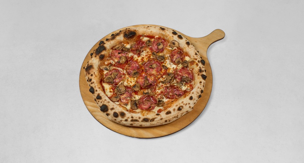 Sos pomidorowy, mozzarella fior di latte, salame napoli, pieczarki, oliwa, oregano