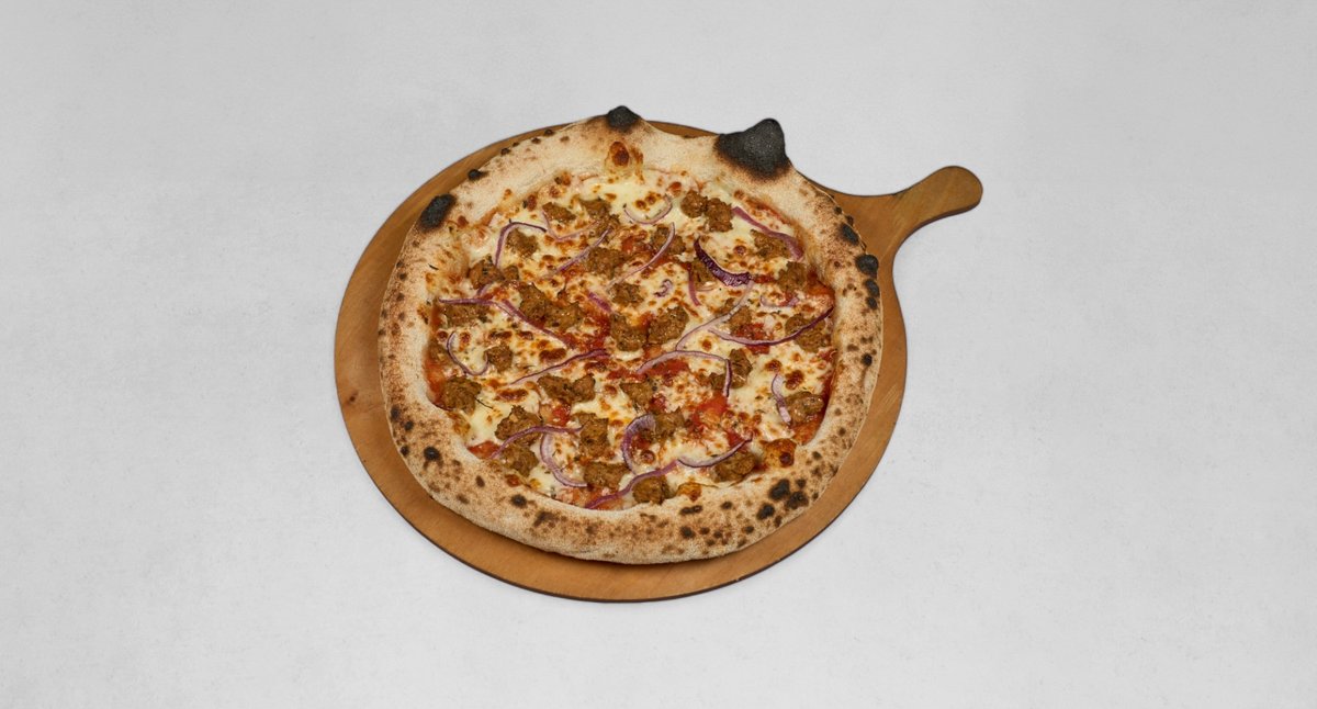 Sos pomidorowy, mozzarella fior di latte, salsiccia, grana padano, czerwona cebula