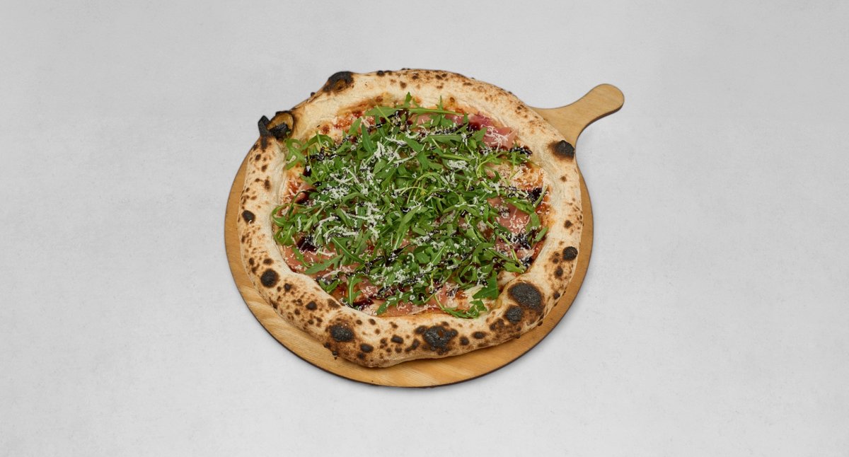 Sos pomidorowy, mozzarella fior di latte, prosciutto crudo, rukola, grana padano, balsamico
