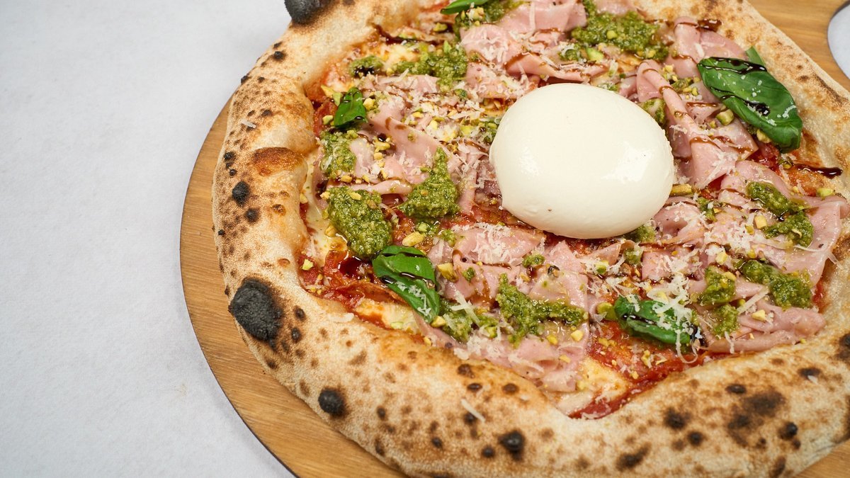 Pesto bazyliowe, mozzarella fior di latte, mortadella con pistacchio, pistacje, ricotta
