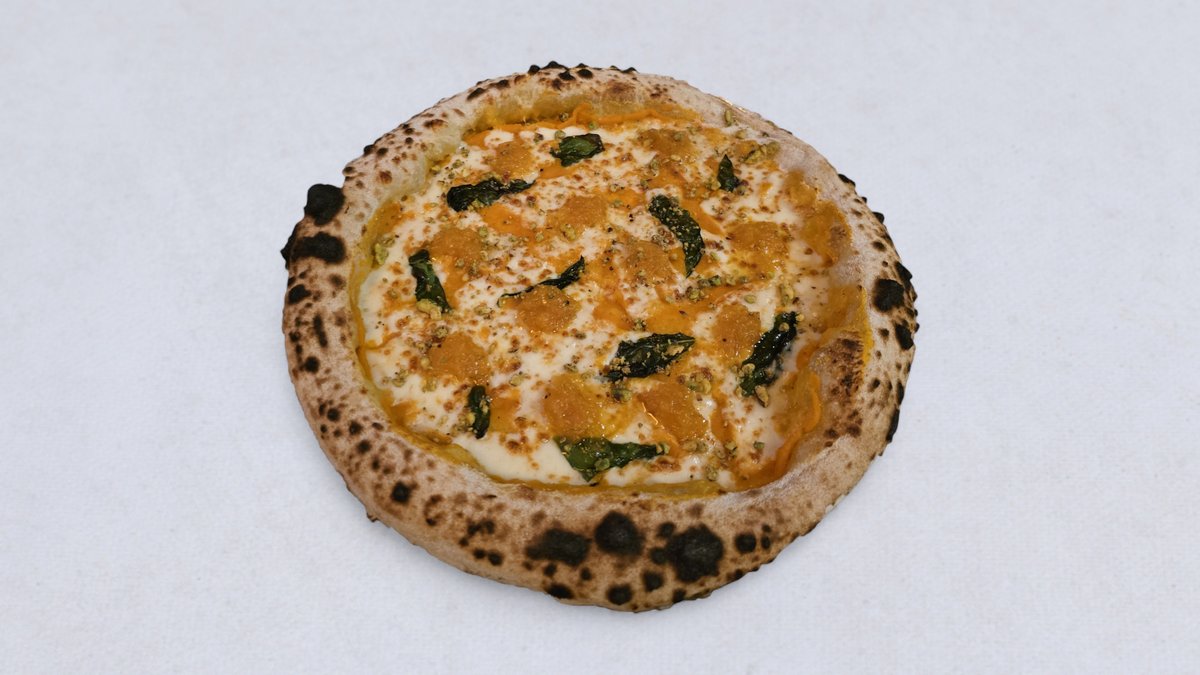puree z dyni, mozzarella fior di latte, bazylia, domowa konfitura z pomarańczy, pistacje, limonka