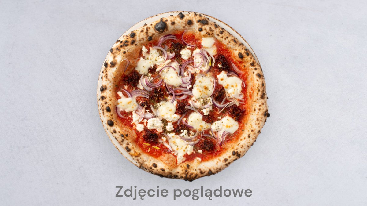 Sos pomidorowy, mozzarella, kiełbasa z dzika, kiszony ogórek, czerwona cebula, świeża papryka, jalapenja,jajko, kukurydza