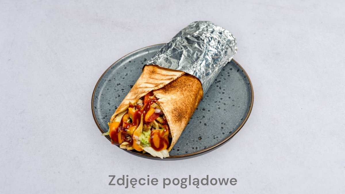 Tortilla, mięso 240 g., surówki, sos. Zdjęcie poglądowe.