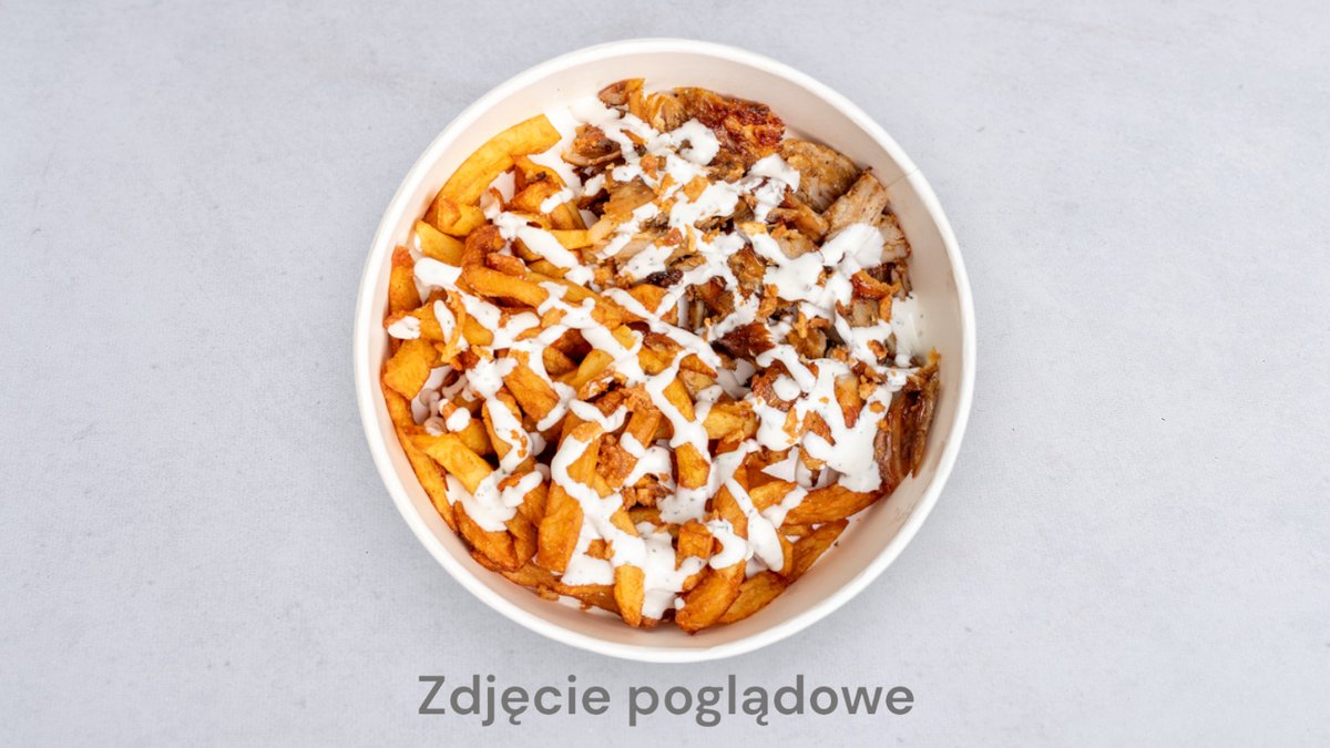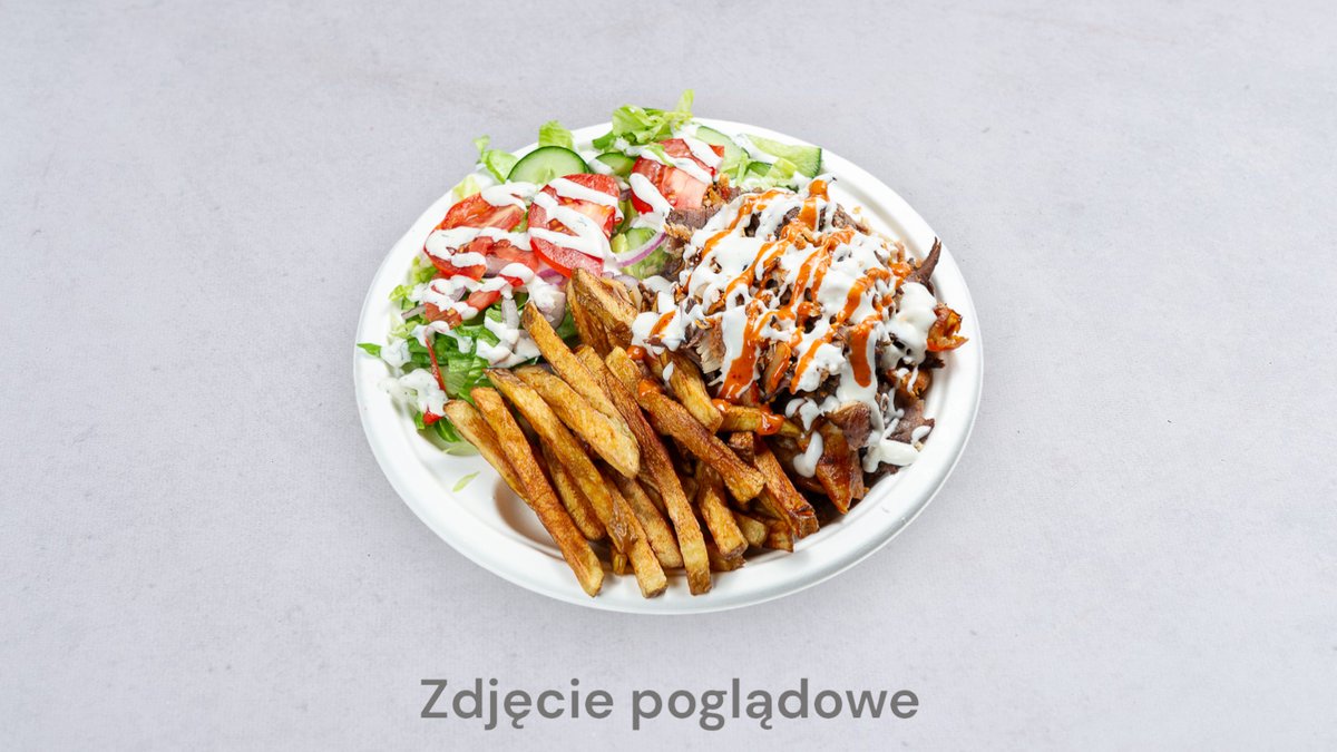 Mięso 160 g., frytki belgijskie 170 g., surówki, sos