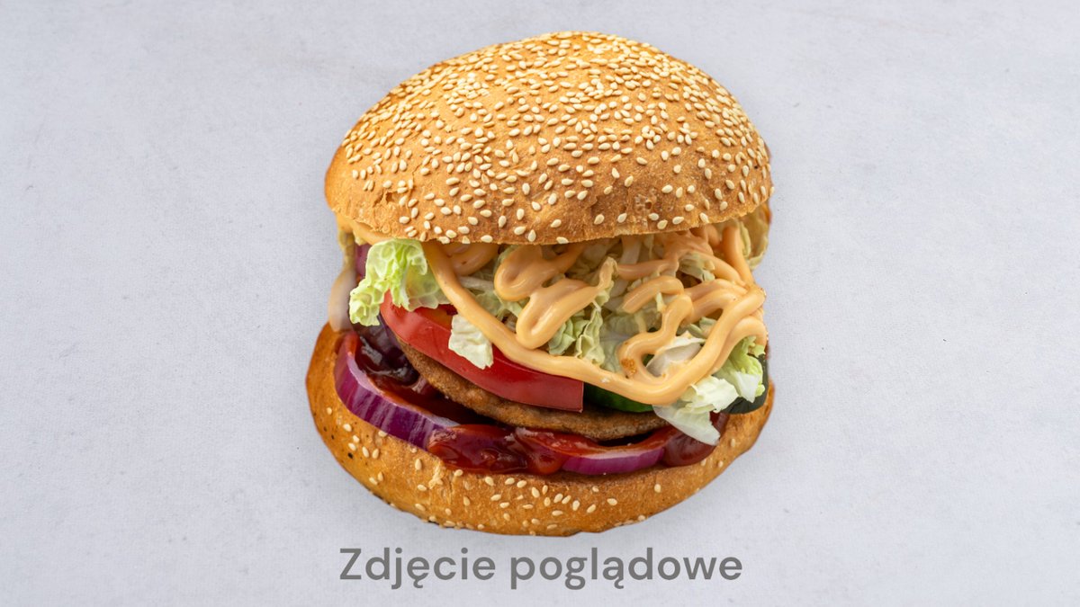 Bułka, 2 kotlety, pomidor, ogórek, cebula, sos