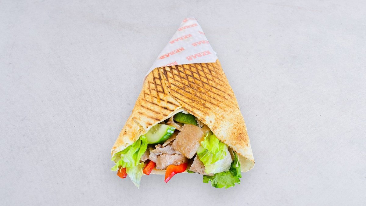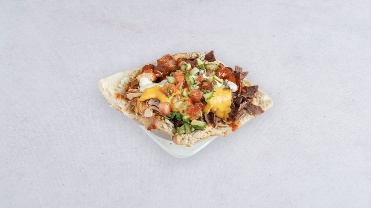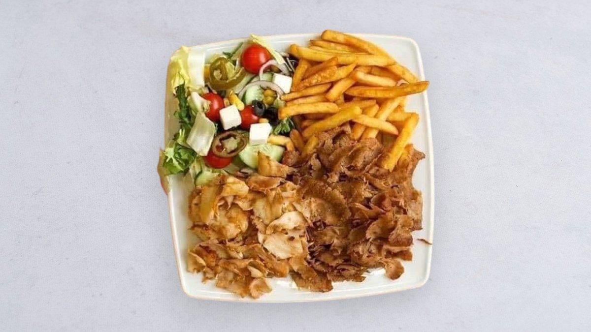 Mięso, frytki, sos, surówka, oliwki, ser, sałata lodowa, ser feta, jalapeño