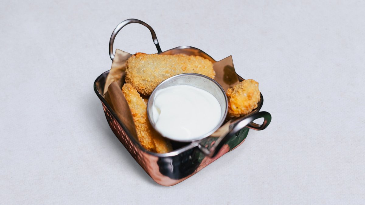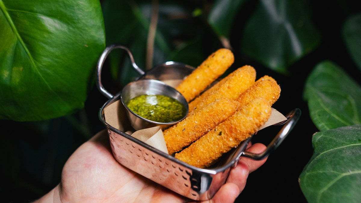 paluszki z sera mozzarella w chrupiącej panierce - 6 sztuk - z sosem bazyliowym