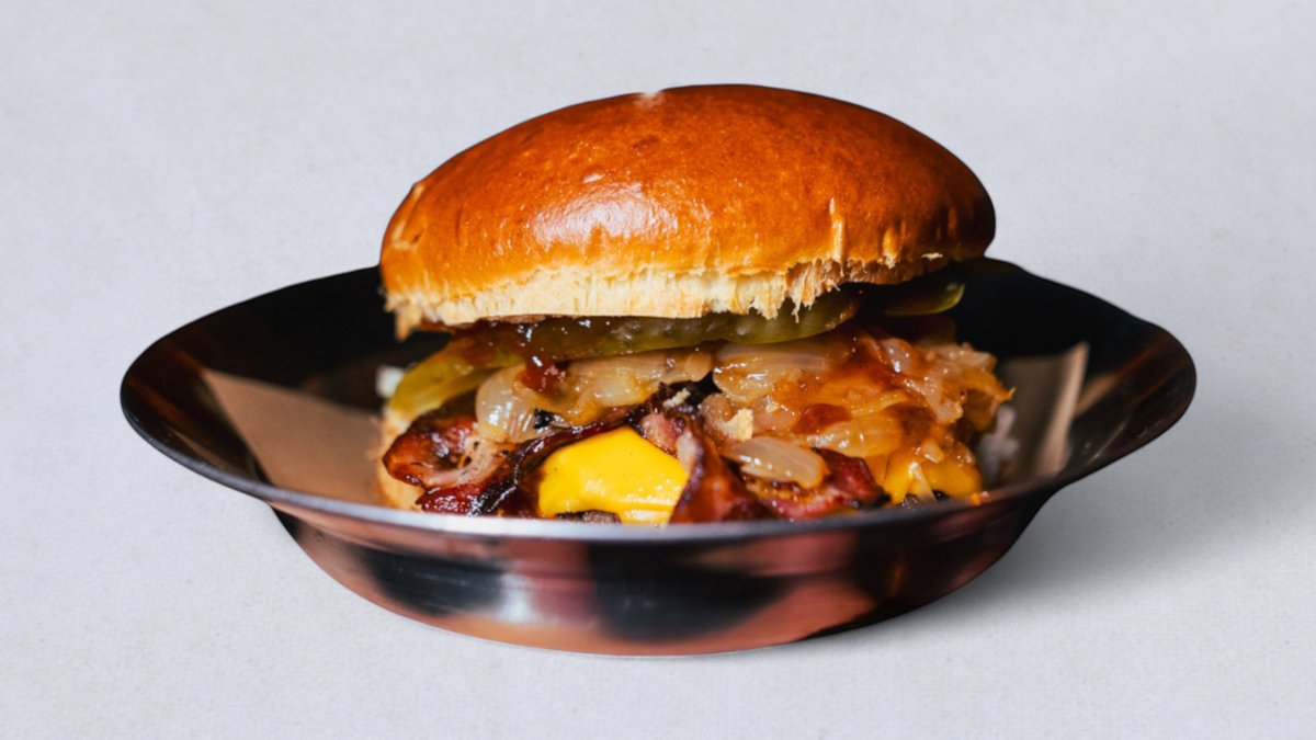 maślana buła, wołowina (3x50g.), bekon, cheddar, marmolada z cebuli, ogórek kiszony, sałata, bbq