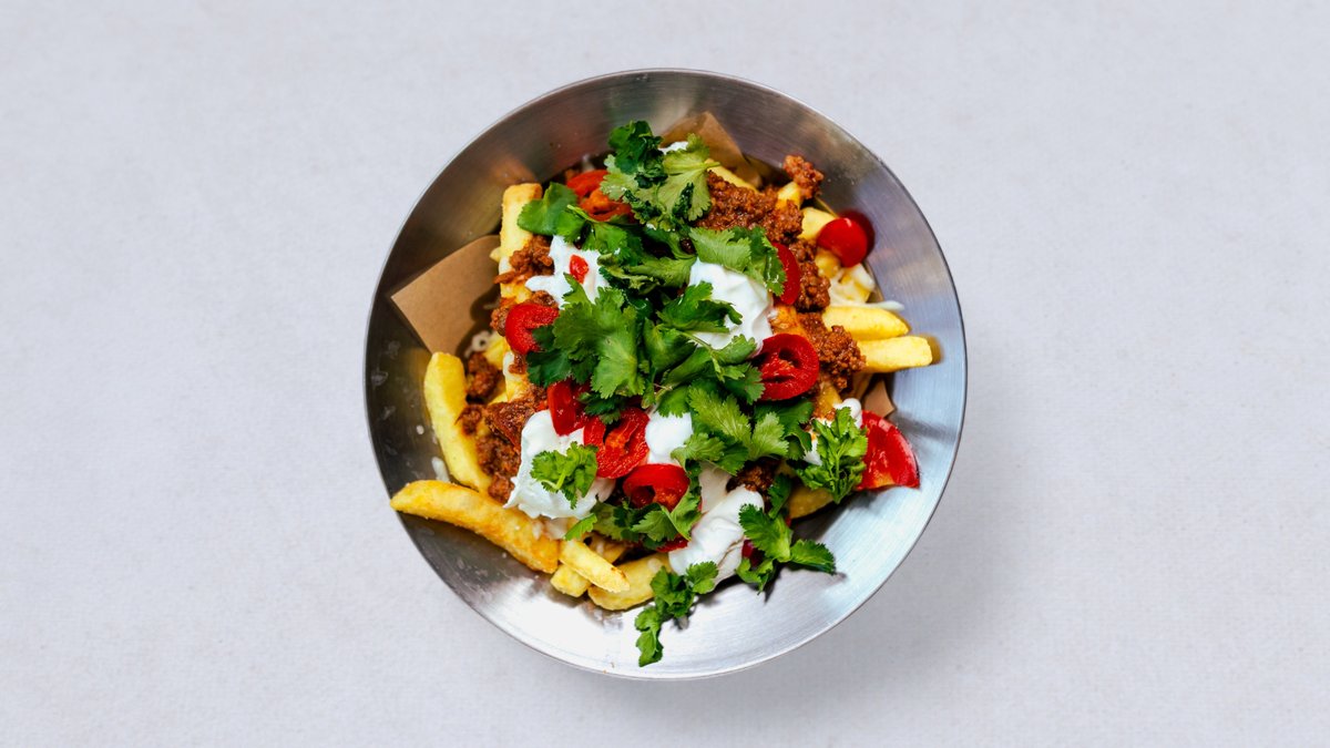fryty, wołowina chipotle, cheddar, jalapeno, kolendra, sour cream