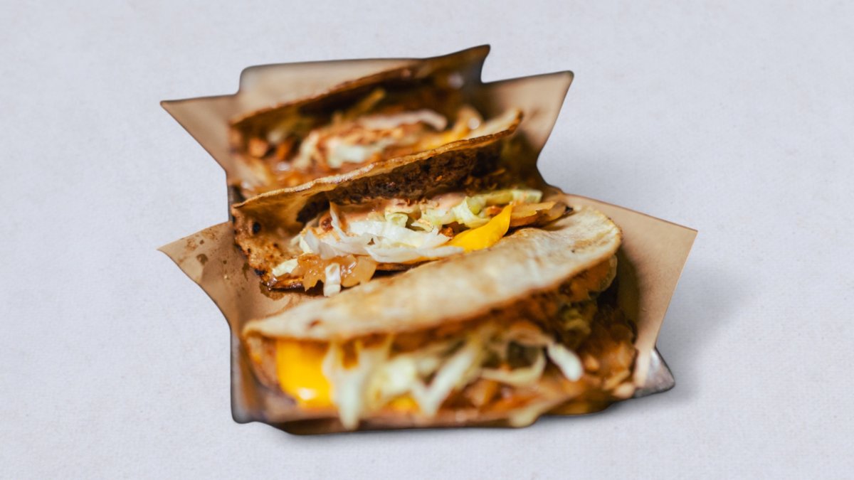 kukurydziana tortilla, szarpana wieprzowina bbq, cheddar, marynowana cebulka, dymka, aioli, 3szt.