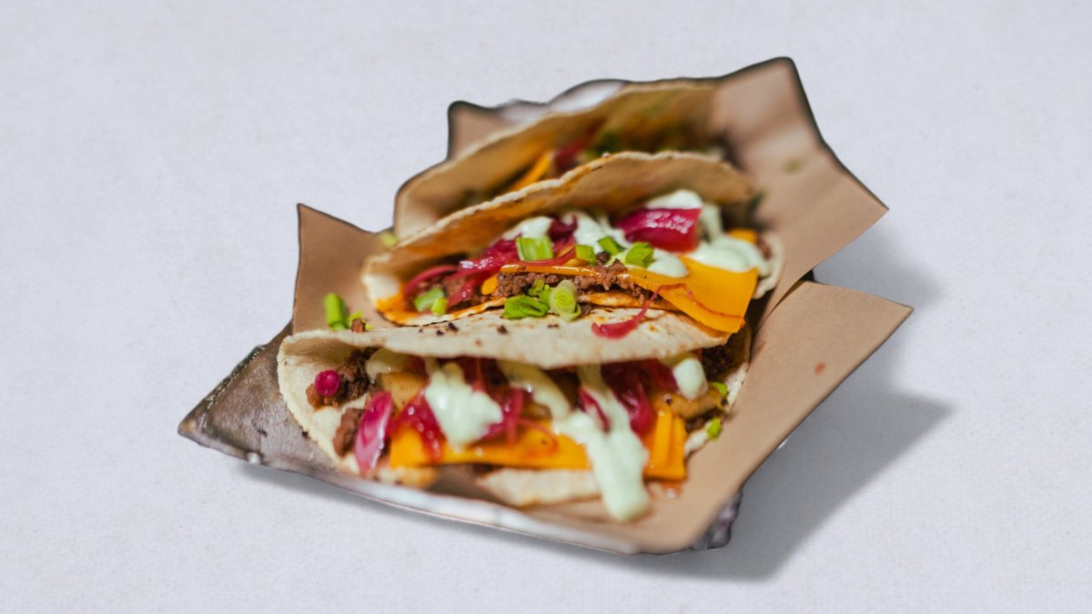 kukurydziana tortilla, wołowina chipotle, cheddar, marynowana cebulka, mango, kolendra, sour cream, 3 szt.
