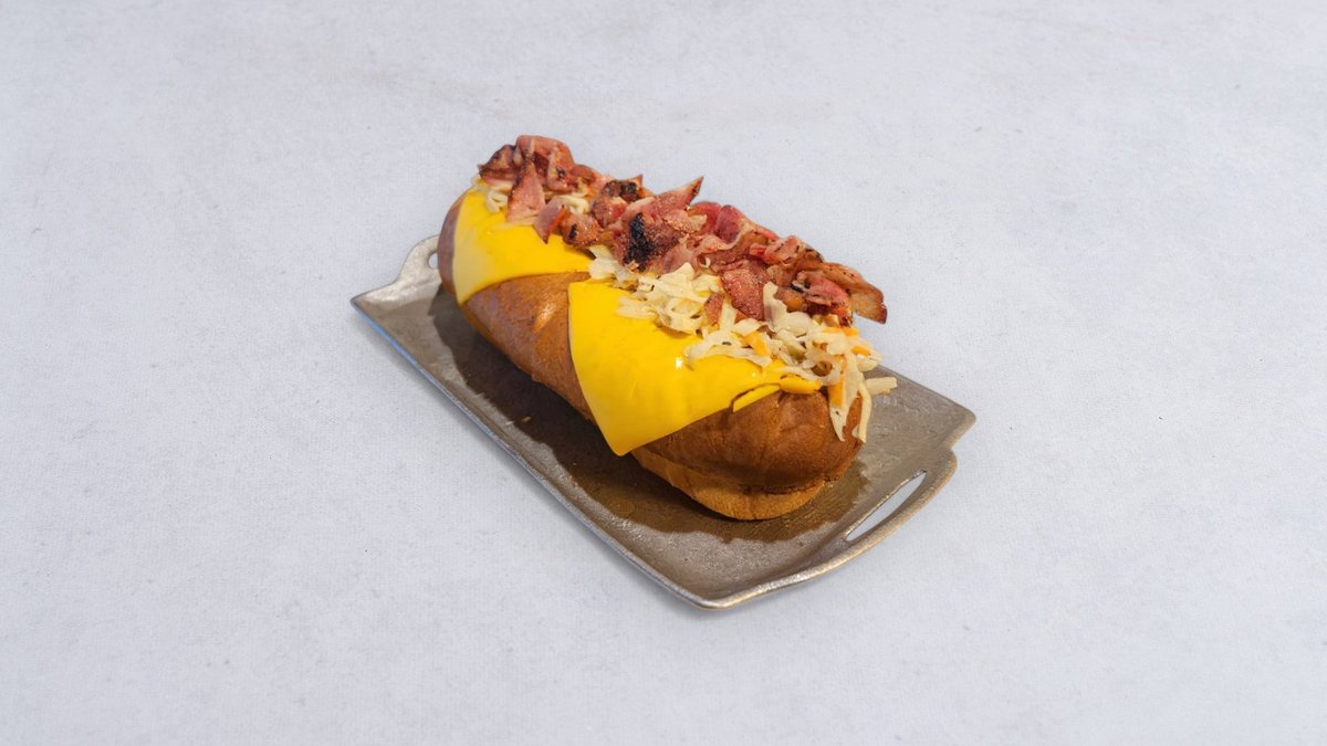 maślana buła, kiełbaska, bekon, cheddar, ogórek kiszony, prażona cebulka, dijonaise