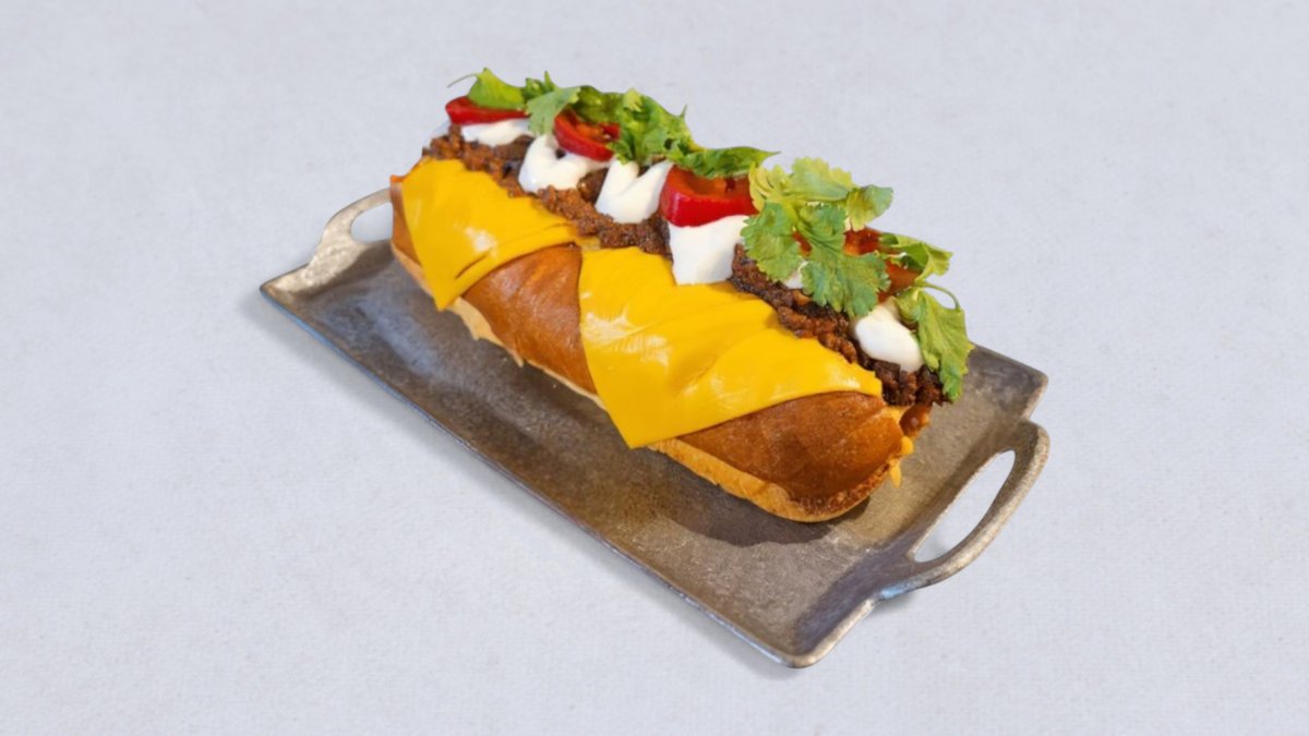 maślana buła, kiełbaska, wołowina chipotle, cheddar, jalapeno, kolendra, sos serowy, sour cream