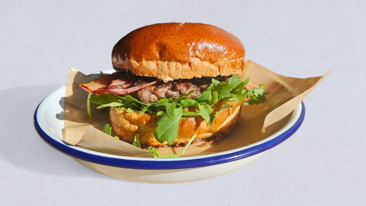 maślana buła, wołowina (340g.), bekon, rukola, masło orzechowe, frużelina jagodowa