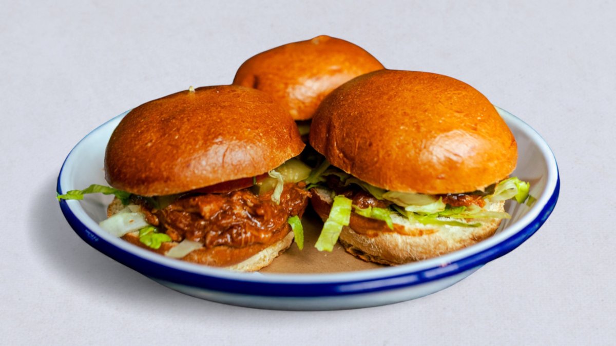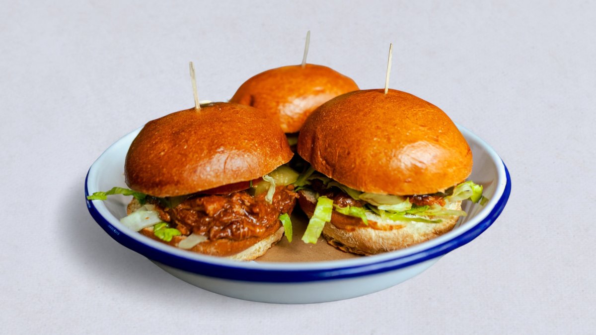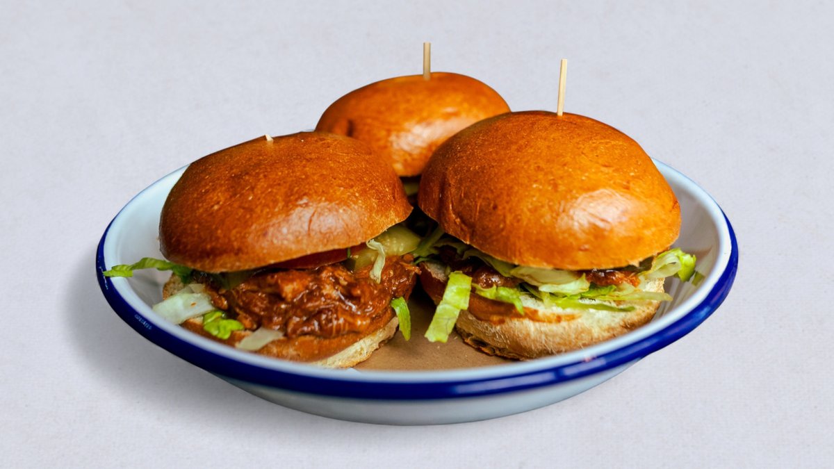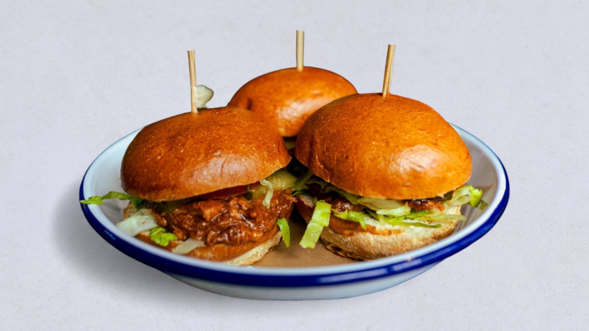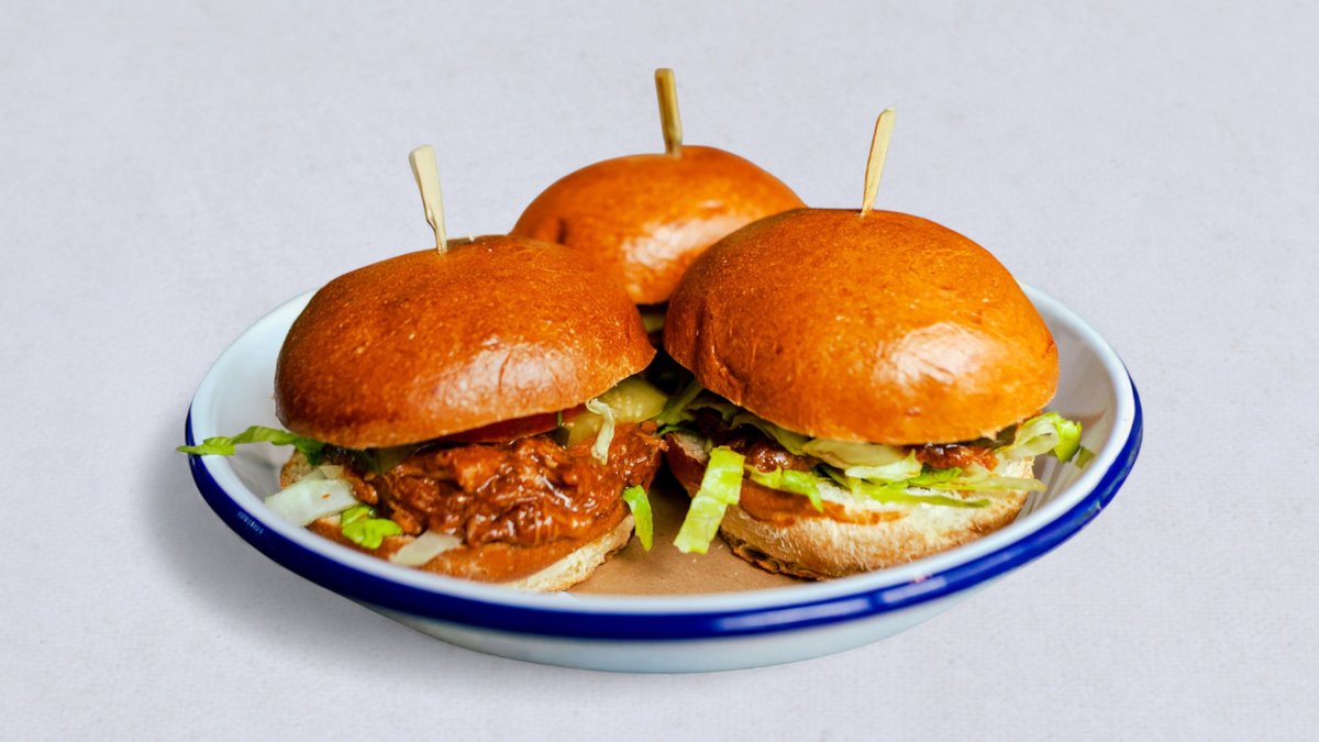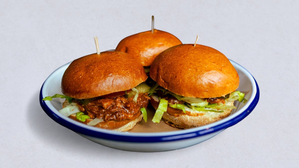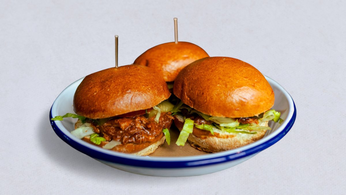 Morowe burgerki (3szt.) w wersji mini (50g. wołowiny w jednym) podawane w bule maślanej.