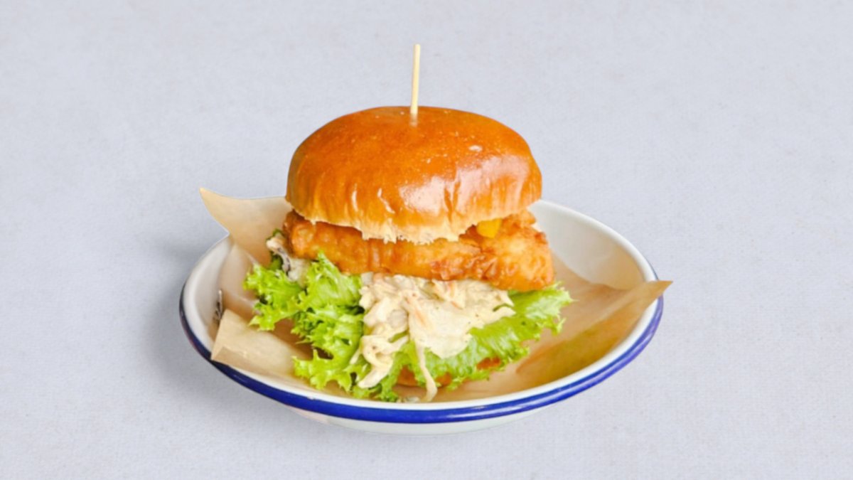 maślana buła, dorsz w cieście piwnym (ok. 150g.), colesław, mango, sałata