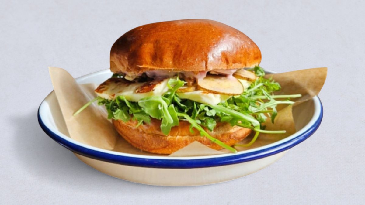 maślana buła, grillowane halloumi (3X50g), grillowana gruszka, orzechy w karmelu, rukola, sos żurawinowy
