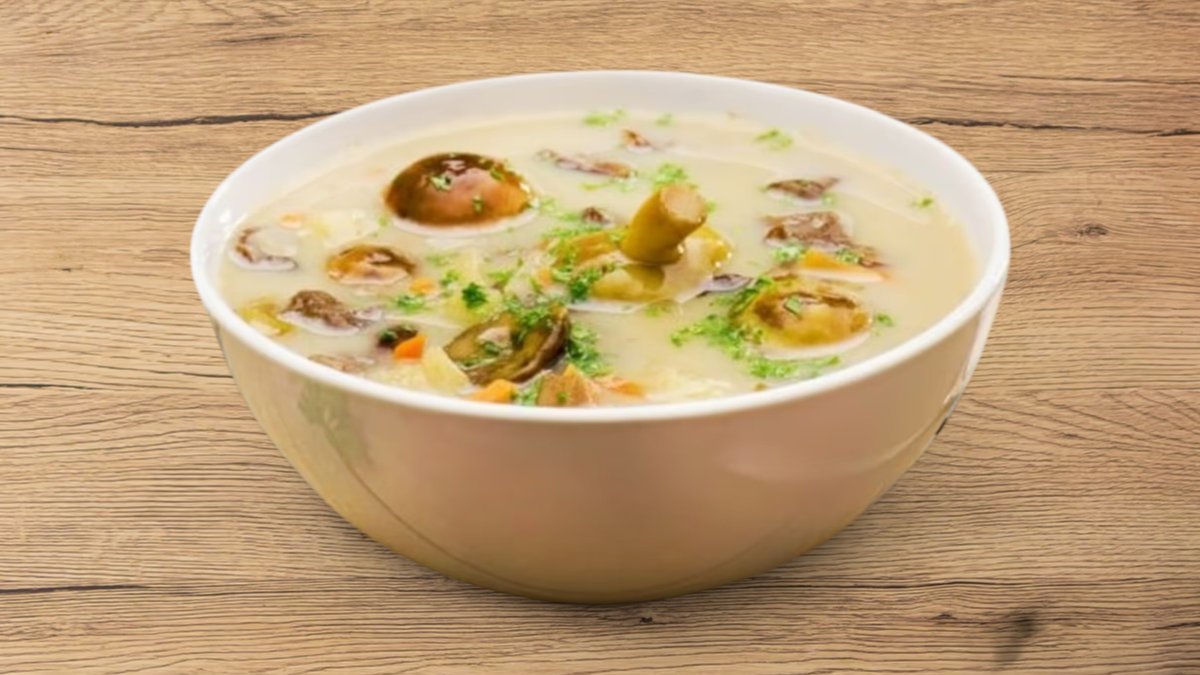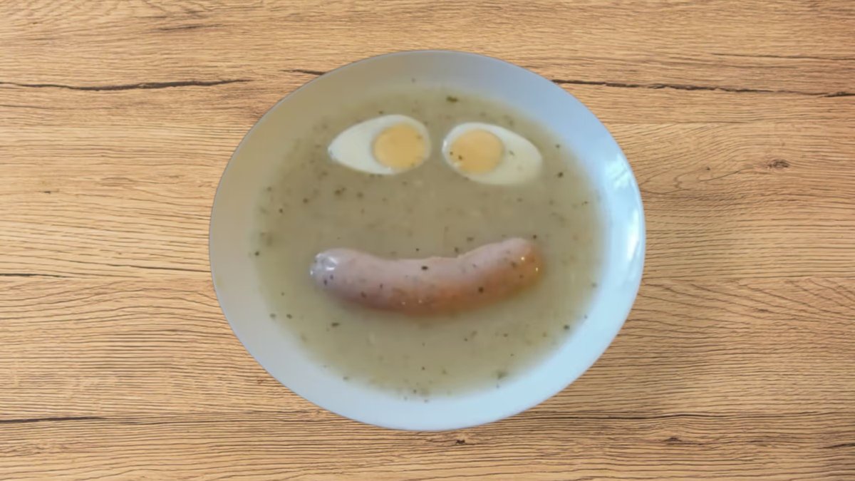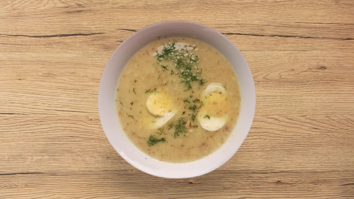 Żurek na zakwasie z dodatkiem boczku, podawany z gotowanym jajkiem. Opakowanie wliczone w cenę.