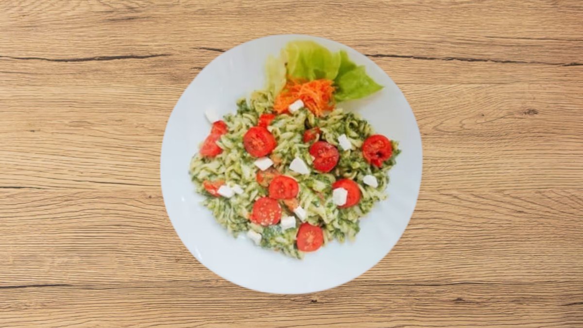 Makaron ze szpinakiem, pomidorkami koktajlowymi i fetą