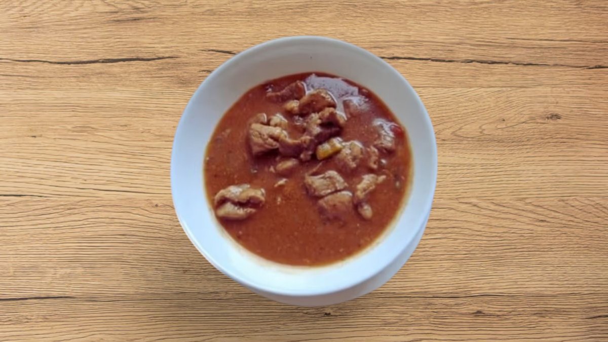 Zupa z ziemniakami, papryką i fasolą oraz kawałkami mięsa wieprzowego. Opakowanie wliczone w cenę.