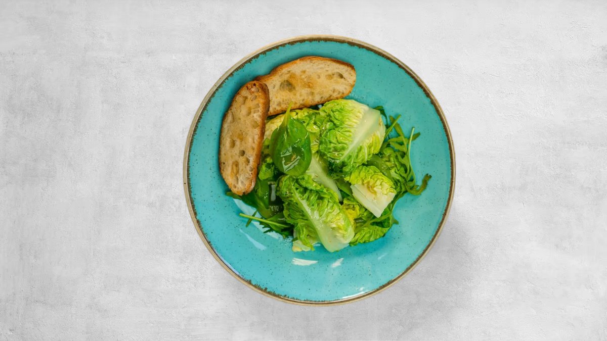 Mix sałat, pieczony burak, pomarańcza, czerwona cebula, prażone orzechy włoskie, dressing cytrynowo-miodowy, grana padano dop, podawana z grzanką