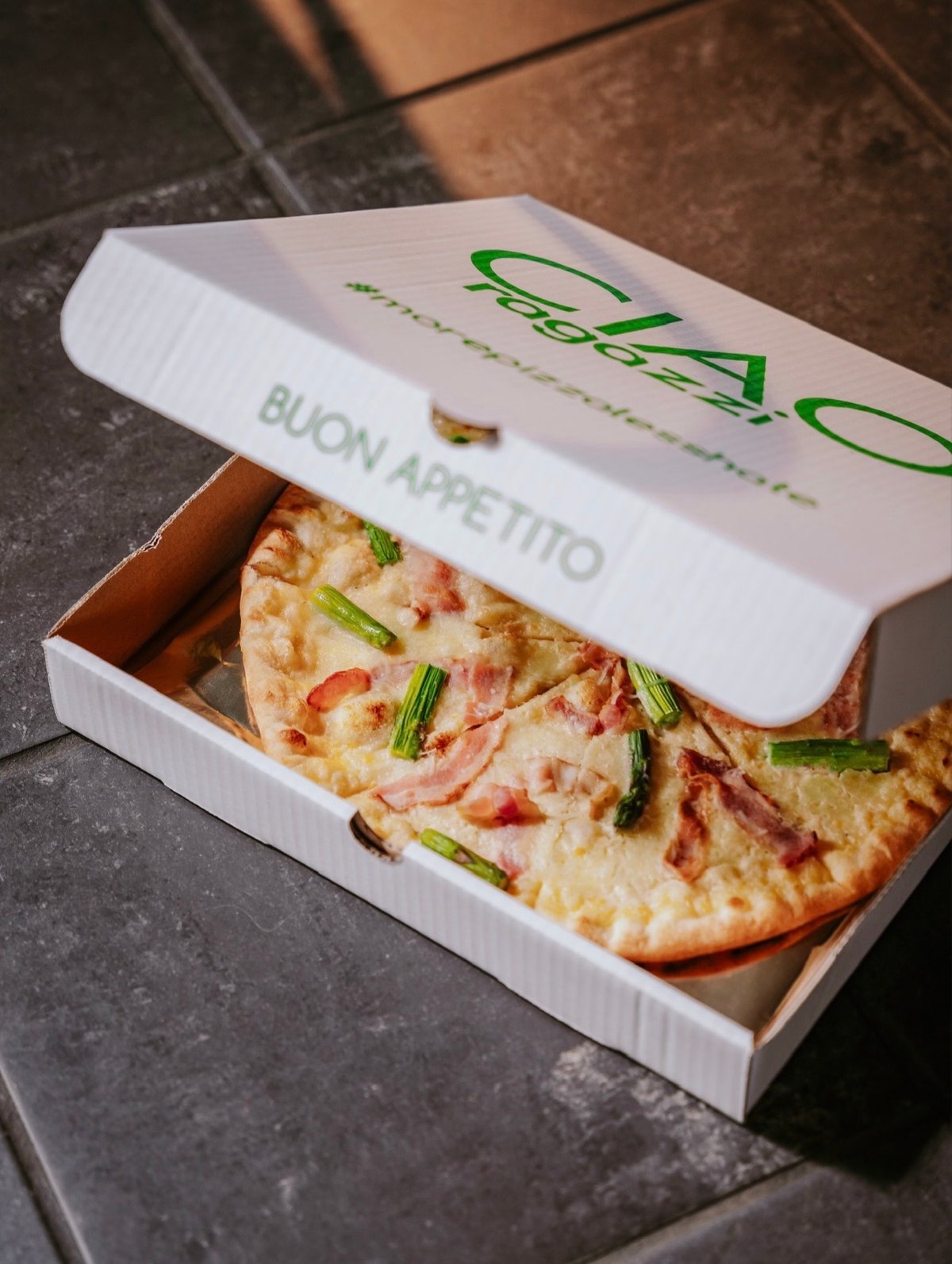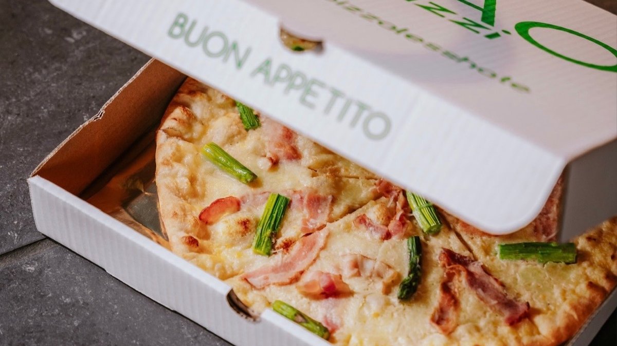 crema, mozzarellą fior di latte, mortadella z Bolonii, kruszona pistacja, ricotta, oliwa cytrynowa, młotkowany pieprz