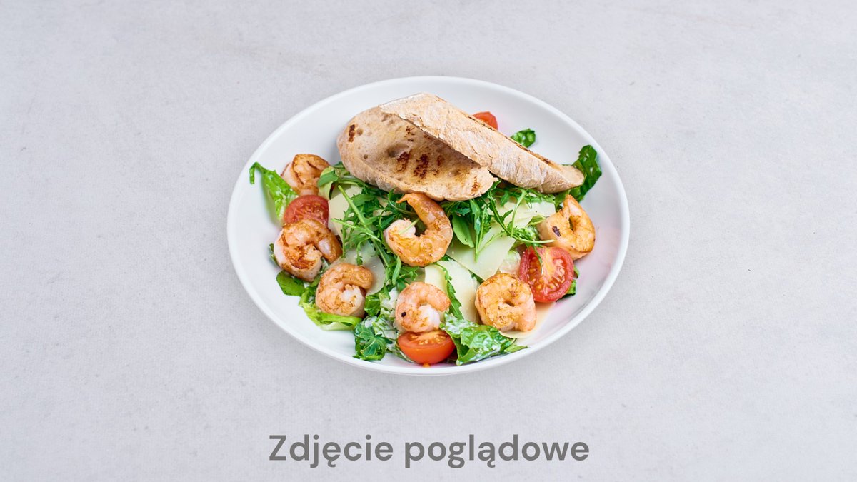 Sałata rzymska baby, krewetki black tiger, kapary, pomidorki koktajlowe, grzanki, grana padano dop, autorski sos na bazie anchois