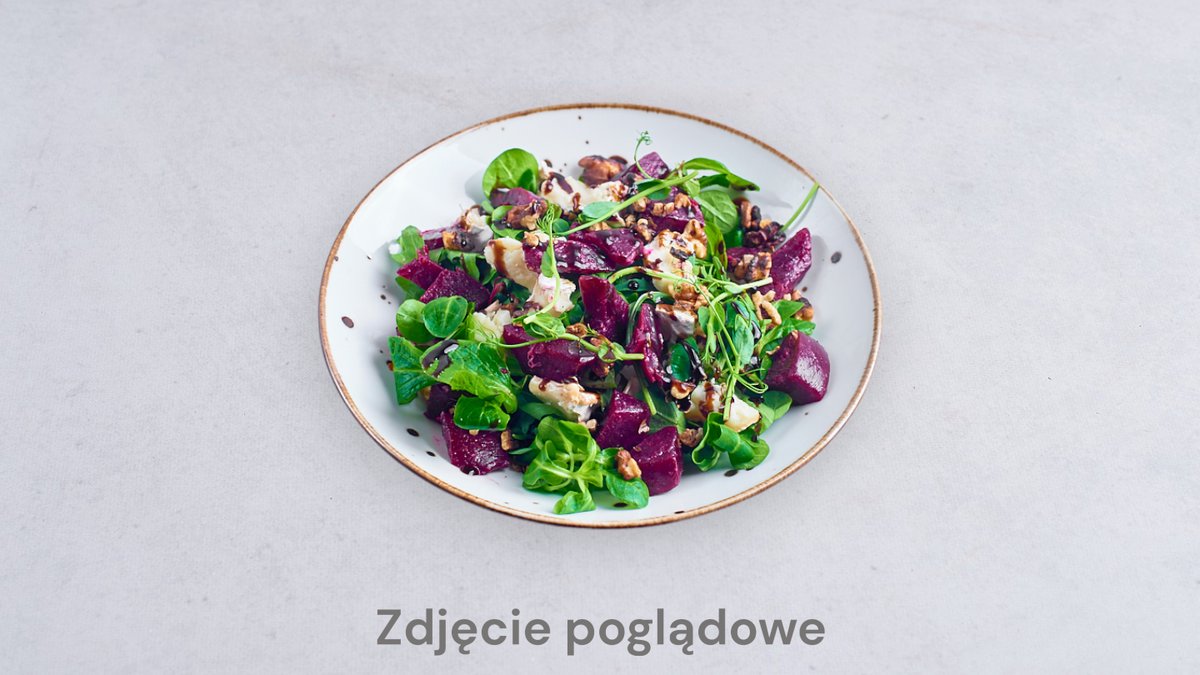Pieczony burak, kremowy ser kozi, rukola, ocet balsamiczny, oliwa extra virgin, miód